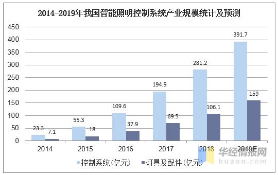 2018年我国智能照明产业中控制系统规模为281.2亿元,灯具及其他配件产品规模为106.1亿元。随着产业技术水平的进步以及下游应用市场的扩展,预计到2019年我国智能照明控制系统规模有望增长至547.3亿元。